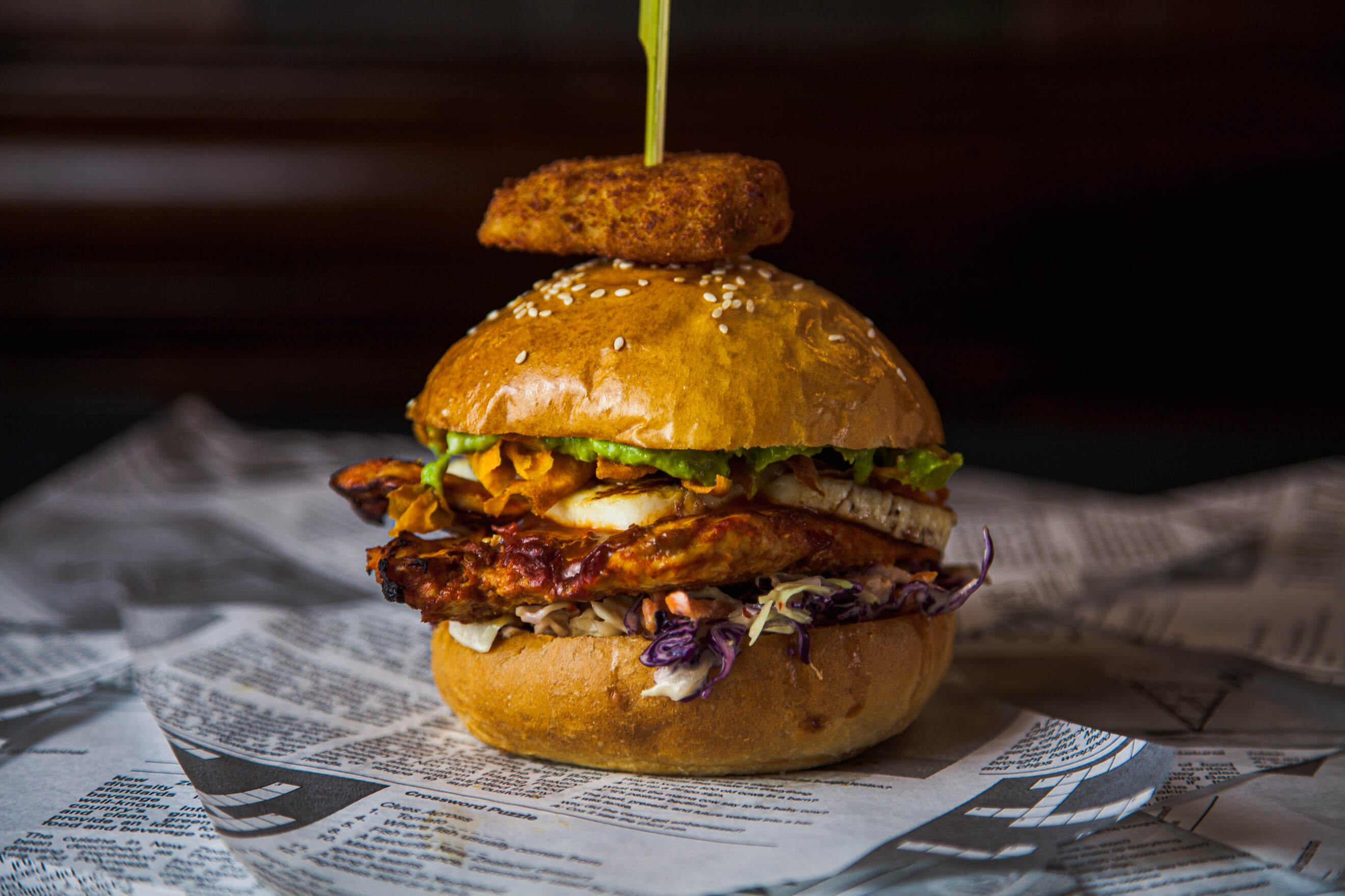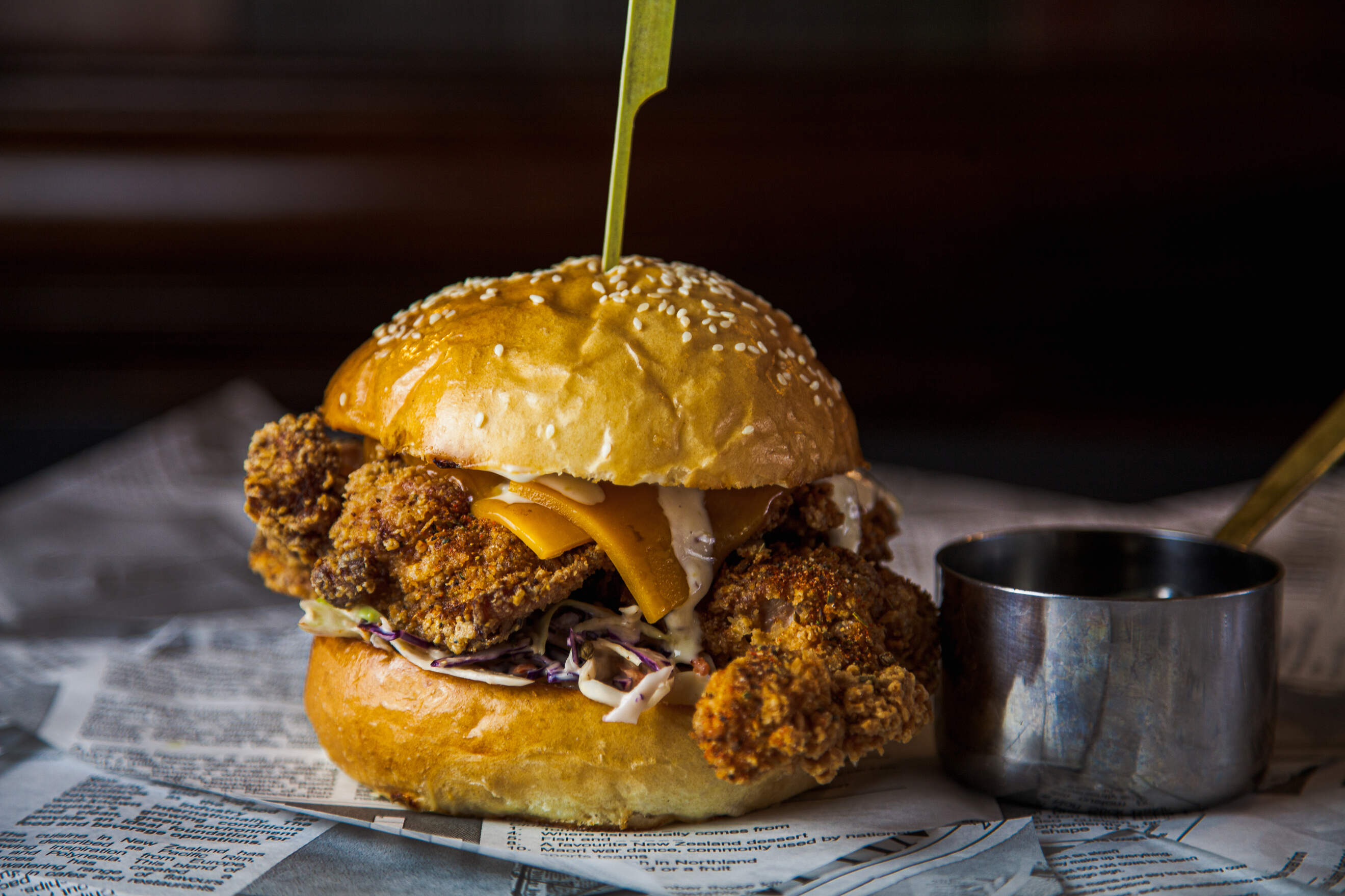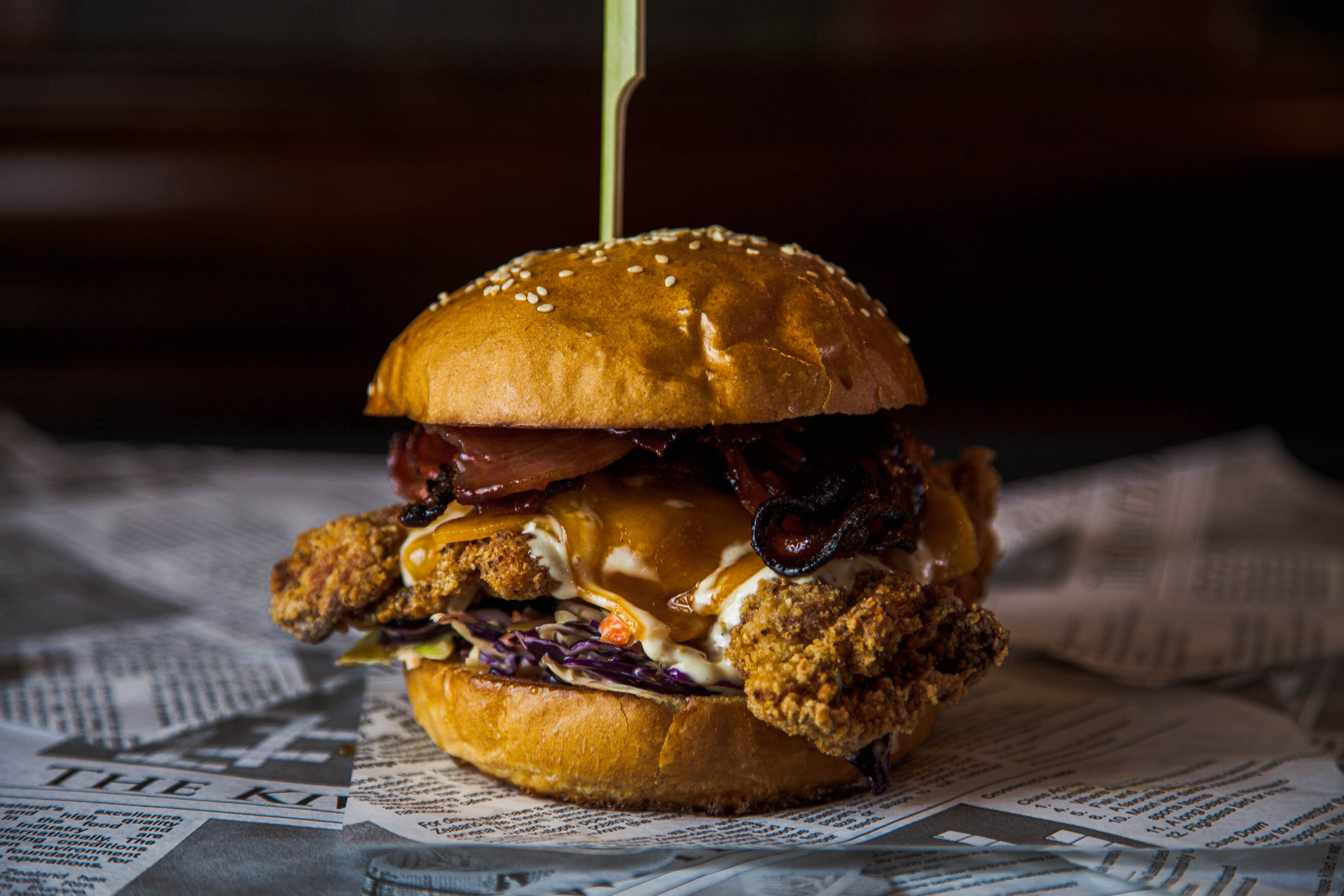 Southern fried chicken, twice cooked maple bacon, slaw, cheddar & kewpie mayoSWAP TO BLACK BEAN PATTY?
