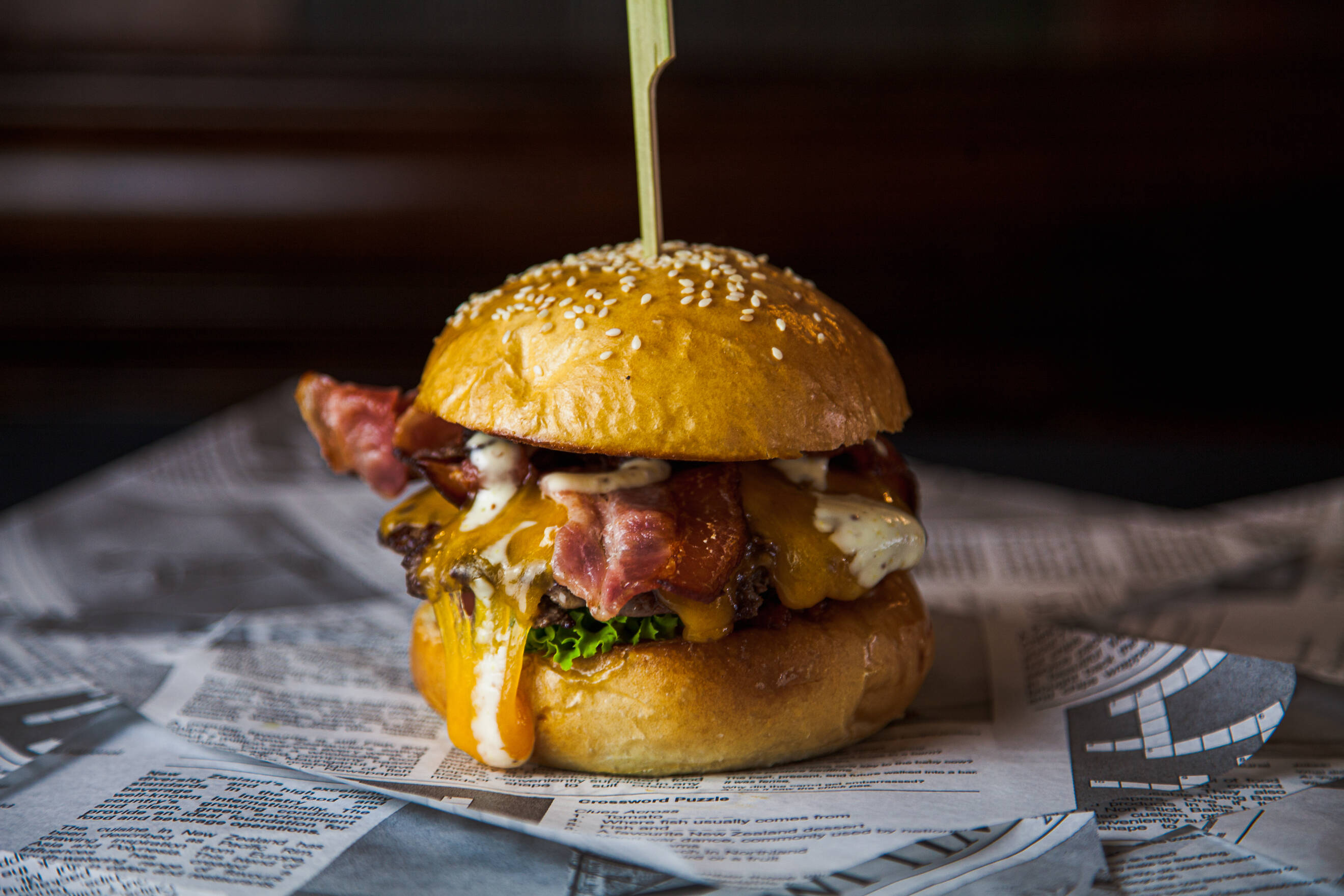Smashed beef patty, bacon, onion, double cheese, pickle, lettuce, relish & aioliSWAP TO BLACK BEAN PATTY?