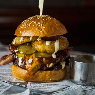 2 x smashed patties, streaky bacon, cheddar, beer battered onion rings, pickles, special BBQ sauce, aioli with a side of pour on cheese sauceSWAP TO BLACK BEAN PATTY?